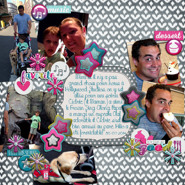 A few years ago, I did two pages with the same kit, one with the photo and one with a journaling card that said what I was thankful for since the past Thanksgiving. I loved the idea and wanted to do it for all our Thanksgiving since my little guy was born. But I never did, so this weekend, I took the opportunity and did a second layout with this kit. The journaling is in French, but in short it says we were thankful for family and friends visiting, for our Florida vacation, for Cedric starting a special program, and for the decision to get a service dog: